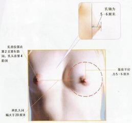 乳房位置适中,在第二~第六肋骨间(根据乳房位置的高低进行划分,是指乳房位于第五肋骨以上者,正如积奇所形容的“上一分则艳媚”,略高于标准位置的乳房让人看来觉得有朝气、有精神、有活力,自然也让人觉得太具挑逗意味,显得“艳媚”;而乳房位于第五肋骨之下者,与高位乳房给人的感觉相反,无论它丰满与否,因它总是有种低垂感,令人觉得丧气,所以在积奇看来“低一分则庸俗”。)内界为胸骨旁线,外界为腋前线。长在这个位置的乳房让人觉得恰到好处,端庄典雅,温柔可人;中国人传统的审美观多重视中正平和之美,这种生长位置也是极其符合中国人中庸之道的美学观点的;这也就是积奇所谓的,“生长部位也非常的雅巧”。一个丰满身材的女性,乳房基底直径为10~12厘米,乳房高度为8~10厘米,是最为美丽的乳房。乳晕直径约为4~5厘米,发育良好的女性乳房,乳头大、长,直径1-1.5厘米,长度1-2厘米,表面略呈桑葚状外观,美观且便于吸允。;乳头的位置在乳房美中起着重要作用:乳头大略位于锁骨中线第五肋骨至第五肋间范围;乳头与奇妙的黄金分割率:0.618有着密切的联系,乳头连线是锁骨平面至双腹肌沟中点平面的黄金分割线,乳头处于黄金分割线上的这种乳房的位置无疑是最完美的;乳头呈圆柱状突出于乳房表面,且略向外翻,两乳头距离大约为20~40厘米,乳头到胸骨中线的距离为10~13厘米,距胸骨切迹20~40厘米,距乳房下皱襞5~9厘米。随着人的身高的增长,各个部分所要求的数据指数应跟着相应提高,但比例是不变的。西方人的营养结构和身体素质与中国人不同,西方女性的乳房明显要比中国女性的丰满挺拔,乳头更大,中国女性切不可盲目追风,不考虑自己本身的特点;中国女性应具有中国传统的蕴藉含蓄之美,乳房以丰满、健美、柔韧,不大不小为美。