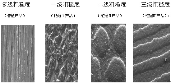 3.表面形态:普通产品为零级粗糙度的表面特征,艳冠I产品为一级粗糙度的表面特征,艳冠Ⅱ产品为二级粗糙度的表面特征,艳冠Ⅲ产品为三级粗糙度的表面特征。(扫描电镜拍照,与标准表面特征图对比一致。)